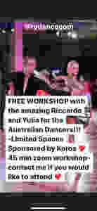 Free Latin Dance Workshop with 10 times World Champions Yulia and Riccardo 45 minutes via zoom Sunday 9 August 2020 at 7 am Perth time or 9 am Sydney time #latindance #worldchampions #freeworkshop #zoomworkshop #dancesport #latindancesport #dancetraining #dancing #livedancetraining #livedanceworkshop #perthdancers #perthlatin #perthdancesport #dancesportaustralia #dancesportwa
